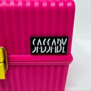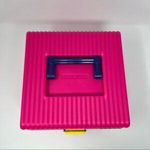 90s Sassaby Storage Case. Plastic. Pink. Measures approximately 9 inches x 9 inches x 6.5 inches when closed. Gently used condition.