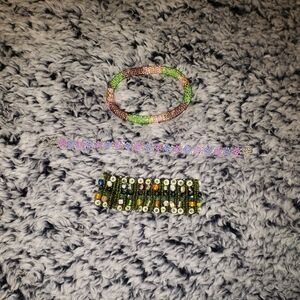 90s Seed Bead Bracelet Bundle. Awesome circa 90s seed bead bracelets. Lot of 3. One is a slip on round bracelet. One is a flower friendship like bracelet. One is a green slip on thicker bracelet with bead and sequin embellishments - some beads are missing. Chunky green one is the only one with flaws. Other two are in great condition. Good used condition; GUC. 💫