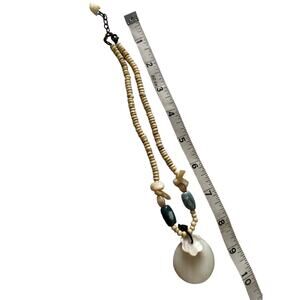 90s adjustable shell beaded choker necklace with pendant. The main portion of the necklace is shell done in the heishi style (small round discs) then there are natural mother of pearl beads, shaped MOP beads, two blue stone beads and a pendant made of a big disc of MOP with an MOP flower on top! Measures 26” on the longest setting. I have a 16" neck, so this fit me like a traditional choker with the pendant hanging right at the throat hollow.