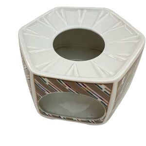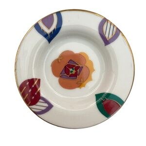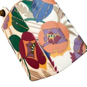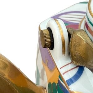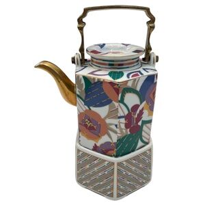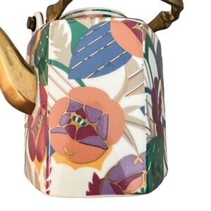 Inspired by a French designer of the 1920s best known for his several rare publications of color prints sone in the beautiful hand colored technique pochoir. Porcelain with brass handle and gilded spout, this teapot includes a base with a side opening to insert a candle sterno for warming, and a pot lid. Pot holds 4 cups of liquid. Floral pattern has bright colors. The style is LIMELIGHT.