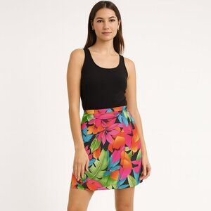 Vintage silk tropical mini skirt, Y2K floral print summer skirt, 90s beach resortwear, bright skirt like Free People, silk skirt Anthropologie style, retro mini like Farm Rio, tropical mini skirt Resort Report vibes, colorful summer outfit, vintage Coogi colors, lightweight vacation skirt, high waist silk skirt, boho summer fashion, vintage skirt like J.Crew Collection, bold floral statement skirt