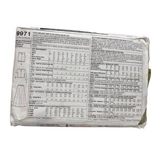 This pre-owned Simplicity 9971 Jessica McClintock sewing pattern includes designs for girls' knit tops and skirts in two lengths. Distressed packaging with signs of prior use.