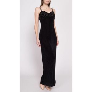 90s Slinky Black Metallic Trim High Slit Maxi Dress - Medium to Large