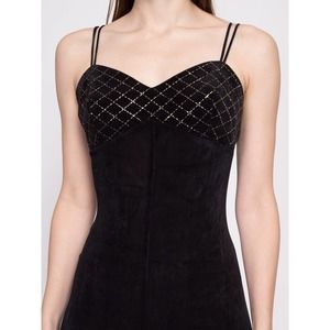 Vintage 90s slinky black formal maxi dress, with metallic trim on the bust, a strappy back, and a front slit. Shown clipped at the back of the bodice on the model until the last two photos.