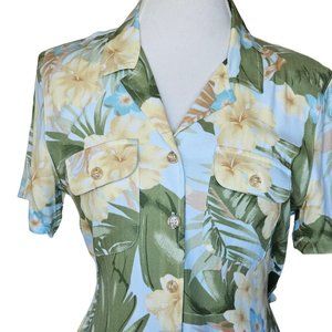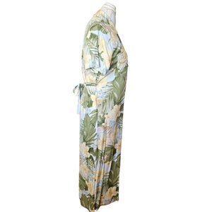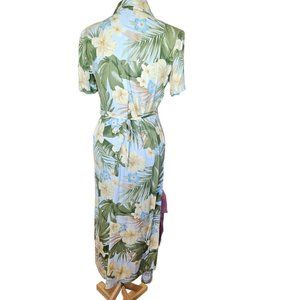 90s Small Tropical Hawaiian Floral Hibiscus Maxi Shirt Dress Sage Green Yellow
