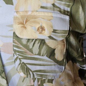 Made of Rayon twill fabric, the dress is machine washable and has a vintage feel to it. The sage green and yellow colors complement each other perfectly, making it a great addition to your summer wardrobe. This dress is a size S, with a long dress length and regular fit. Get ready to turn heads with this Hawaiian-inspired dress!