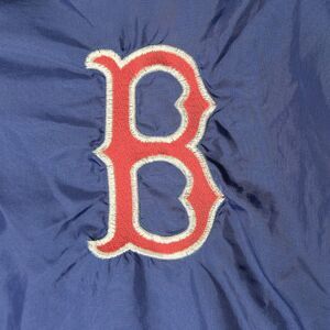 This is a vintage 90s Starter Boston Red Sox pullover jacket in size XL, made of nylon material. It is officially licensed by the Major League (MLB) and is designed for men. The jacket is blue in color and features a diamond pattern. It is suitable for games practice and bears the emblem of the Boston Red Sox team. Made in Korea.