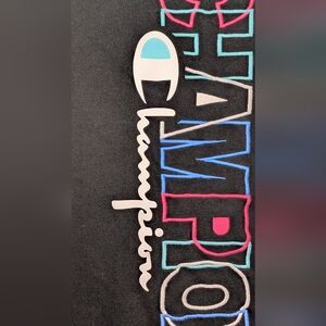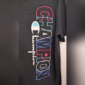 Black t-shirt with colorful embroidered Champion graphic and print logo. Features bold lettering in pink, blue, teal and white. Embroidered "C" logo on left arm