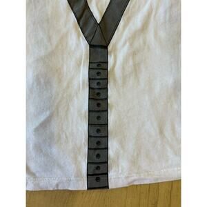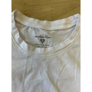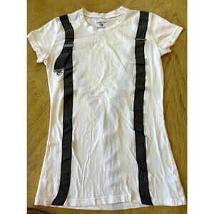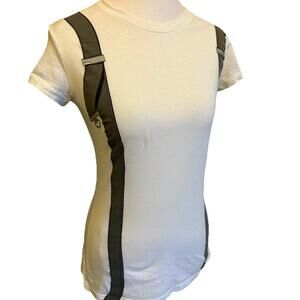 The product is a women's Anchor Blue T-shirt in size M, featuring a white color and made to look like your wearing suspenders. a 90s-inspired design. This Halloween cosplay shirt is perfect for adding a retro flair to any outfit. Made with a regular fit, this top is a great choice for fans of 90s fashion and those looking to channel their inner pop culture guru.