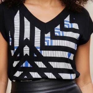 VTG blouse with bold geometric design. Black & blue accents. Comfy lightweight soft polyester. Perfect for packing, non wrinkle. 40” bust