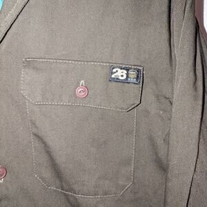 Description: 90s Twenty Six Red olive green military button up shirt, nice thick dark olive green button down with pockets on chest, military army style, skateboarding brand, grunge wear, perfect for fall wear