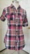 Rugged but feminine. Red, black, brown and tan plaid with a subtle metallic silver shiny thread sparkling throughout the top. Collared, button down, half length sleeves with optional button and tab to wear rolled up. Nice, longer length. GUC