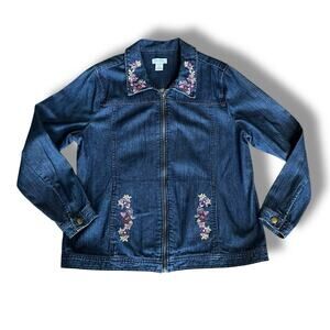 Vintage 90s City Blues by Koret embroidered denim jacket. Stylish denim jacket with floral embroidery, full front zipper closure, front pockets and button closure sleeves.