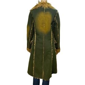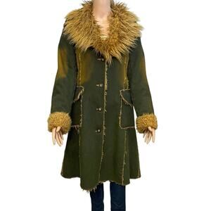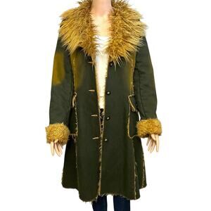Awesome long penny lane style coat. Shaggy faux fur lining, collar, and sleeve cuffs. Dark green with tan sections. Very fun unique retro inspired piece. Great for an eclectic wardrobe.