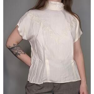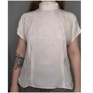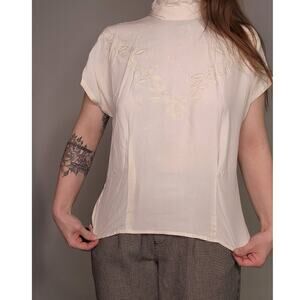 90s Vintage 100% Silk Light Pink / Cream Mock Neck Short Sleeve Top with a floral design on the front, that is subtle and blends in with the top. This top buttons down the entire center back(shown in photo). This piece has some ever so slight sheerness to it as well.