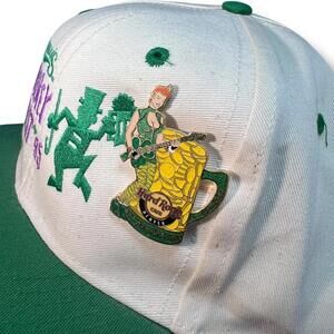 Rare 1995 Bennigan's "Blarney Blast" snapback hat featuring embroidered graphics and a collectible enamel Hard Rock Cafe Denver mermaid pin attached to the front. White crown with green bill and button accents. Classic snapback closure.