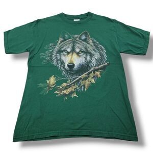 90s Vintage Anvil Shirt Size Medium Nature Tee Wolf Graphic Print T-Shirt Green