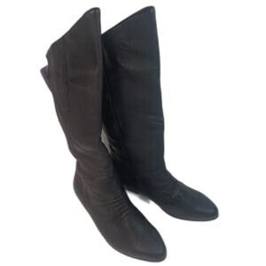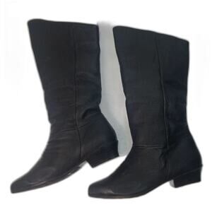 90s Vintage Basic Editions black leather calf high boots with almond shape toe. Pointed top of boot slowly slopes down towards the back ending 1.5 inches lower than front. Ruched on top of foot.