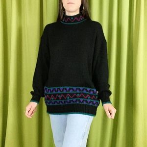 90s Vintage Black Purple and Teal Abstract Print Knit Turtleneck Sweater