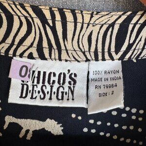 90s Vintage Chico's Black Cream Cave Art Zebra Print Silver Button Front Tunic Size 2 / Large