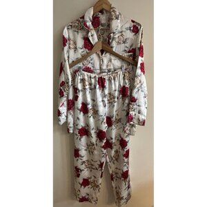 90s Vintage Cream and Red Roses Floral Preloved Silky Pajama Set Pants Small