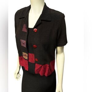 Add a bold, vintage flair to your wardrobe with this dark brown midi dress and matching jacket set by Positively Attitude. The sleeveless dress features a striking red textured waist accent, while the cropped short-sleeve jacket is adorned with artistic red block detailing, statement buttons, and classic shoulder pads for an elegant, structured look.