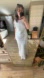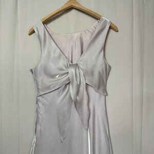 In very good, vintage, lightly worn, preloved condition.a V back that you can still wear a bra with, flowy bias cut tie back detail, left underarm side seam closure, sleeveless bodice and a bias cut maxi length silhouette. This is black tie, formal, evening, old hollywood, snow angel, holiday parties, classic, bridal, winter wonderland, feminine, 90s, vintage, elegant, romantic vibes.