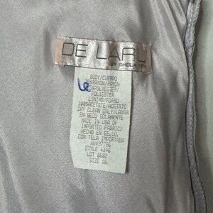 This Vintage 90s Formal Maxi Dress from De Laru by Sheila Yen was Made in the USA and constructed in silver with lightest pink iridescent 75% Rayon, 25% Polyester flowy fabric with 100% Acetate fabric full lining. It features a high round neckline,