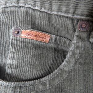 90s Vintage Eddie Bauer High Rise Corduroy Pants. Cross Between a Boot Cut & a Straight Leg. Retro, Classic, Casual Pants with Chunky Cognac Leather Logo. Mix Between an Olive Green, Khaki Green, and Dark Sage Green