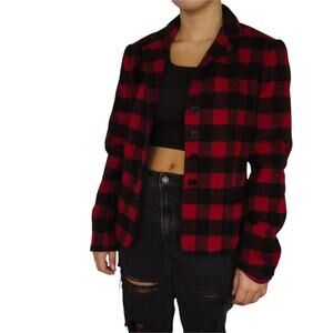1990s Vintage Evan Picone Red and Black Plaid Coat. Buffalo Plaid Collared, Single-Breasted Wool Pea Coat. Between a Blazer and a Peacoat. Can be Worn Formally as a Twee Overcoat or Casually.