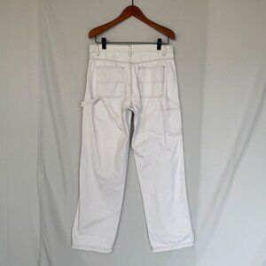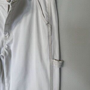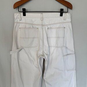 These Vintage 90s Straight Leg Carpenter Jeans from Gap was Made in Indonesia and constructed in 100% Cotton bone, warm off white denim twill fabric. They feature a mid rise, button zip fly closure, contrast stitching, 2 slant front pockets, 2 back square patch pockets, left hammer loop, right side slant cargo carpenter pocket and a slightly fitted through the hips relaxed thigh straight leg silhouette. These are 90s, relaxed, utility, boyish, coastal, neutral, streetwear, minimalist vibes.