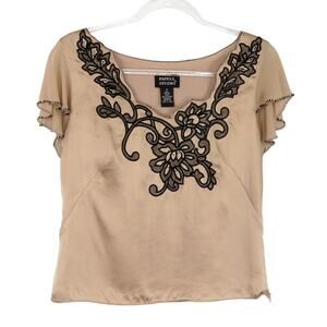 90s Vintage Pappel Studio Tan Creme Satin Embroidered Glam Regency Blouse Small