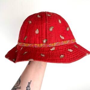 Vibrant reddish orange paisley print bucket hat with thin pink / orange trim around. Light discoloration on inner trim, shown in photos.