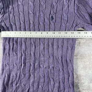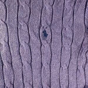 This product is a vintage 90's Ralph Lauren cable knit women's sweater in size small. The sweater features a classic pullover style in a vibrant purple color, perfect for adding a pop of color to any outfit. Made with quality materials and a timeless design, this sweater is a stylish and versatile piece that would make a great addition to any wardrobe.