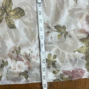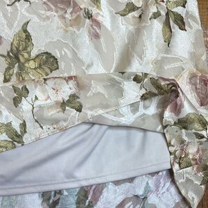Fully lined with a light cream and pink rose floral print lace overlay. Stretchy elastic waist. If your a smaller size you could also wear with a belt as a dress! I did and got lots of compliments