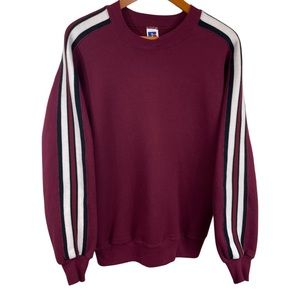 90s Vintage Russell Athletic Cross Crew Neck Sweat Shirt L Stripe Sleeve Maroon