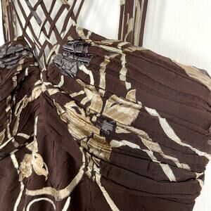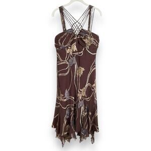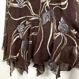 STUNNING chocolate brown chiffon midi dress with shimmery gold / bronze / silver florals