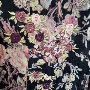 This Vintage 90s Maxi Dress from STARINA was Made in India and constructed in 100% Rayon black, pink, burgundy, sage green and ivory moody floral print flowy fabric. It features a round neckline, long loose sleeves, large floral embroidery on front chest, small floral embroidery through out, matching tonal floral fabric triangular insets and a loose oversized full maxi length silhouette. This is 90s, whimsigoth, vintage, romantic, all season floral, boho, modest, dark cottagecore, hippie, grunge, goddess, granola girl, day to nignt, garden party vibes.