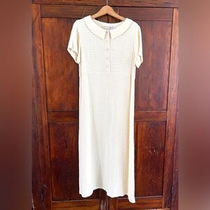 Soft cream/beige textured check pattern with a lightweight, airy feel. Features a Peter Pan collar, button front detail, short sleeves, and a flowy midi length. Made from a rayon/acetate blend for drape and comfort.