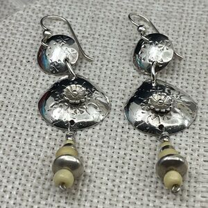 Design: Tiered silver discs with etched floral or sunburst motifs, accented by yellow and cream-tone bead dangles