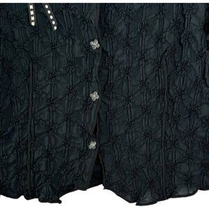 This Vintage 90s Fitted Top by Tzeadle Design Room is Made in USA is constructed in 96% Cotton. 4% Elastane black stretch fabric that is created by elasticated floral smocked pattern throughout. It features a V neck lapel collar, lucite flower button front closure, long sleeves, a fitted silhouette and a removable black and white floral brooch. This an be layered an used as a lightweight jacket. This is 90s, vintage, whimsigoth, lagenlook, office, avant garde, chic goth, boho minimalist vibes.
