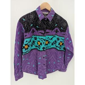 Vintage aesthetic shirt, boho chic button-up, retro paisley top, 90s-inspired fashion, bold statement shirt, trendy patterned blouse, artsy vintage shirt, Western boho vibes, purple and teal outfit, festival fashion top, Vintage Western shirt, boho cowgirl top, retro rodeo style, paisley Western blouse, cowboy chic shirt, Western-inspired fashion, purple and teal ranch shirt, trendy Western wear, country girl outfit, rodeo-ready button-up