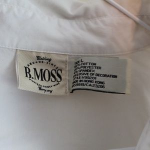 B. Moss 90s Vintage White Button Down Blouse with white buttons and embroidered floral details on front panel and side of arm. Pre-owned, but in good condition.