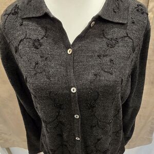 90s Vintage Worthington Sweater Women's Large Gray Beaded Floral Knit Button Up