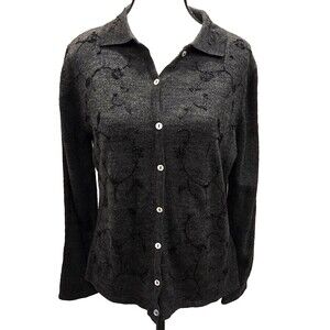 Vintage Worthington Sweater Womens Large Gray Beaded Floral Knit Button Up 90s
