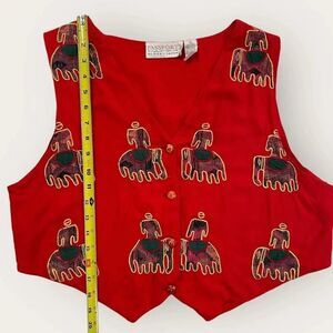 - red vest with purple, green, and gold embroidery and applique of a printed fabric, in the shape of people and elephants.