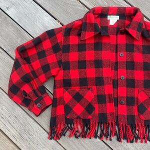 90s Vtg Plaid Wool Fringe Lumberjack Jacket XS Small Women Red Black Sportables
