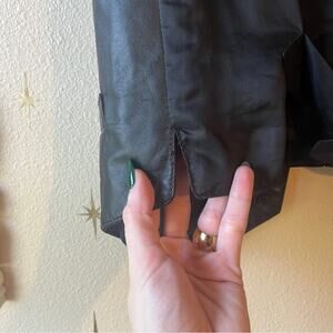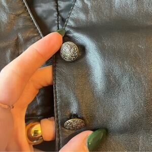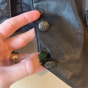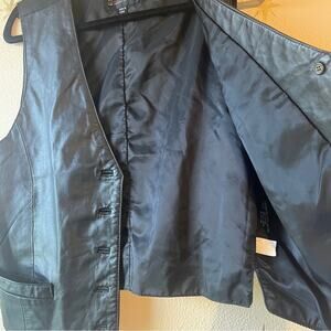Timeless black leather vest. Features button closure. Ideal for layering. Bottom two buttons are a bit loose, can be tightened by hand with needle and black thread. Excellent condition.