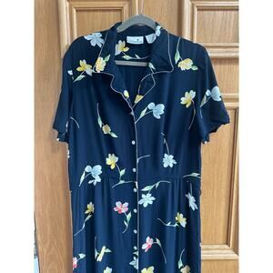 Step into vintage 90s style with this Liz Claiborne floral midi dress, perfect for fans of Courtney Love, Hole, and the grunge revival. With a dark navy background and scattered pastel blooms, this collared, button-down dress channels the edgy-feminine aesthetic of the era.