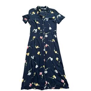 90s Women's Floral Midi Dress Grunge Navy Button Front Collared Size 10